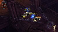 Besonders an den letzten Bilder sieht man: Der Schaden auf dem ersten Gegner steigt stetig an, der Gegner im Hintergrund wird von dem Stein nicht weiter geschädigt.